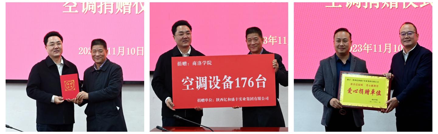 為進(jìn)一步改善學(xué)校辦學(xué)條件,經(jīng)友好協(xié)商,陜西億和盛豐實(shí)業(yè)集團(tuán)有限公司向我校丹江校區(qū)學(xué)生公寓樓C棟捐贈(zèng)價(jià)值60余萬元的176臺空調(diào)設(shè)備。11月10日,我校舉辦空調(diào)設(shè)備捐贈(zèng)儀式。陜西億和盛豐實(shí)業(yè)集團(tuán)有限公司董事局主席黃鵬、董事長黃濤出席捐贈(zèng)儀式。校長范新會(huì)代表學(xué)校接受捐贈(zèng)并向陜西億和盛豐實(shí)業(yè)集團(tuán)有限公司頒發(fā)捐贈(zèng)證書。副校長郭瑾主持捐贈(zèng)儀式并向企業(yè)頒發(fā)捐贈(zèng)牌匾。