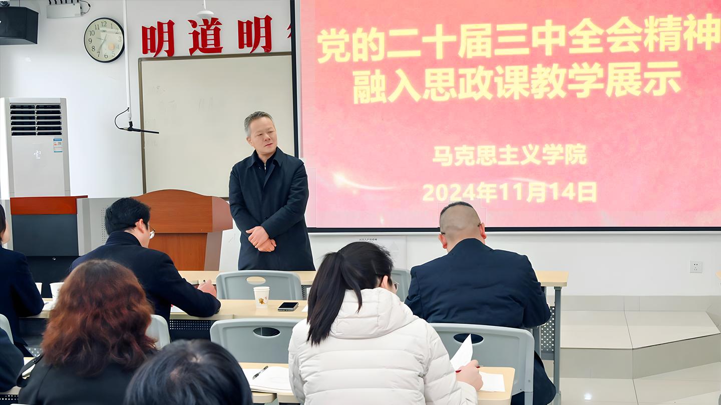 教學(xué)展示中,馬克思主義學(xué)院楊增強(qiáng)教授圍繞全會精神的理解、融入思政課的對接點(diǎn)和方式方法作了輔導(dǎo)報(bào)告。青年教師劉健、王曉霞、朱琳分別以《為什么全過程人民民主超越了西方民主》《順勢而為:加快發(fā)展新質(zhì)生產(chǎn)力》《特色產(chǎn)業(yè)助力鄉(xiāng)村振興》為題,開展了形勢與政策、習(xí)近平新時代中國特色社會主義思想概論等課程的模擬教學(xué)。