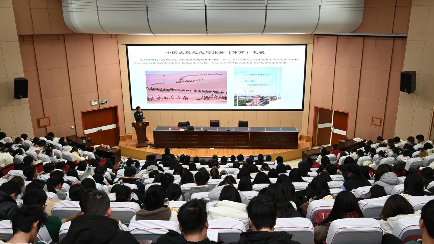聘任儀式結(jié)束后,張婧教授作了題為《如何做好自己健康的第一責任人》的報告。她從影響健康的因素出發(fā),提出“運動零食計劃”的新理念,對部分體育鍛煉案例進行分析,最終以研究成果反哺實踐應(yīng)用。楊濤教授以《中國式現(xiàn)代化與體育旅游業(yè)高質(zhì)量發(fā)展》為題,從中國式現(xiàn)代化與體育旅游發(fā)展、綠色發(fā)展理念的內(nèi)涵與價值、體育旅游產(chǎn)業(yè)的高質(zhì)量發(fā)展、綠色發(fā)展理念與高質(zhì)量發(fā)展的邏輯關(guān)系、體育產(chǎn)業(yè)與健康養(yǎng)老、文化旅游融合發(fā)展五個方面展開詳細闡述,結(jié)合商洛實際情況提出了“體育+旅游+康養(yǎng)”的融合發(fā)展新模式。