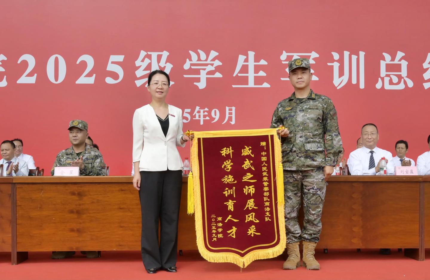 權(quán)雅寧在講話中代表學(xué)校向中國(guó)人民武裝警察部隊(duì)商洛支隊(duì)表示感謝并向支隊(duì)贈(zèng)送錦旗。