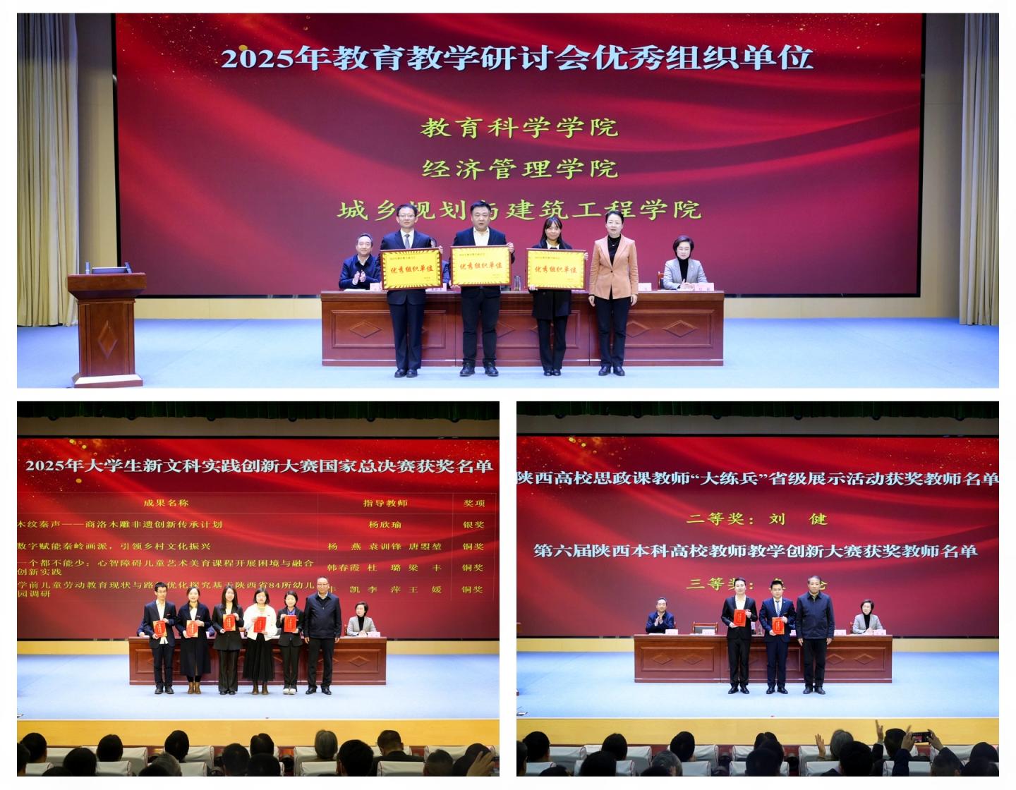 大會(huì)表彰了2025年教育教學(xué)研討會(huì)優(yōu)秀論文獎(jiǎng)獲獎(jiǎng)教師、第七屆教師教學(xué)創(chuàng)新大賽獲獎(jiǎng)教師、2025年校級(jí)教育教學(xué)成果獎(jiǎng)獲獎(jiǎng)教師、2025年省級(jí)優(yōu)秀本科教學(xué)案例獎(jiǎng)獲獎(jiǎng)教師、陜西高校思政課教師“大練兵”省級(jí)展示活動(dòng)獲獎(jiǎng)教師、第六屆陜西本科高校教師教學(xué)創(chuàng)新大賽獲獎(jiǎng)教師、2025年大學(xué)生新文科實(shí)踐創(chuàng)新大賽國(guó)家總決賽獲獎(jiǎng)項(xiàng)目指導(dǎo)教師及教學(xué)研討會(huì)優(yōu)秀組織單位。
