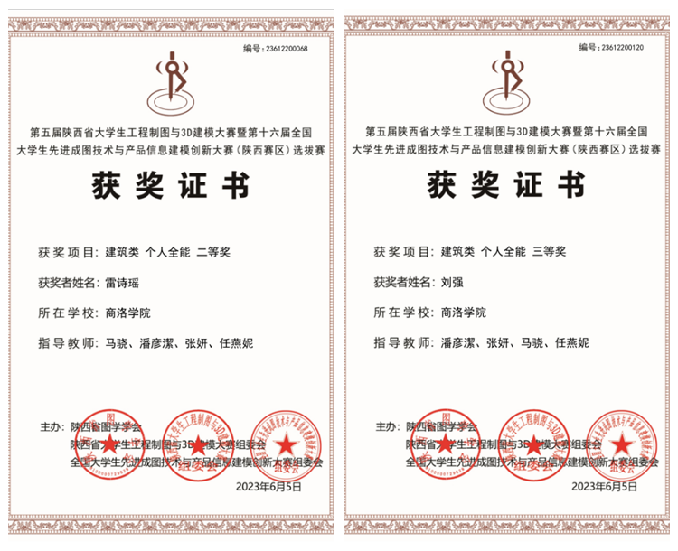 6月5日,2023年第五屆陜西省大學生工程制圖與3D建模大賽暨第十六屆全國大學生先進成圖技術與產品信息建模創(chuàng)新大賽(陜西賽區(qū))選拔賽結果揭曉,我校城鄉(xiāng)規(guī)劃與建筑工程學院9名學生參賽,5人獲得國賽參與名額,其中2人獲得比賽獎項。雷詩瑤在建筑類(個人全能)中獲二等獎,劉強在建筑類(個人全能)中獲三等獎。