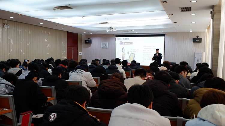為全面提升師生防范電信網(wǎng)絡(luò)詐騙的意識與能力,維護(hù)校園安全穩(wěn)定,3月7日下午,學(xué)校邀請商洛市公安局四級警長劉佩鑫,在北新街校區(qū)和丹江校區(qū)連作兩場防范電信詐騙專題報(bào)告會。校黨委委員、宣傳部部長王霄飛,電信學(xué)院黨委書記袁訓(xùn)鋒分別主持兩校區(qū)報(bào)告會。各二級學(xué)院輔導(dǎo)員及學(xué)生代表500余人參加報(bào)告會。