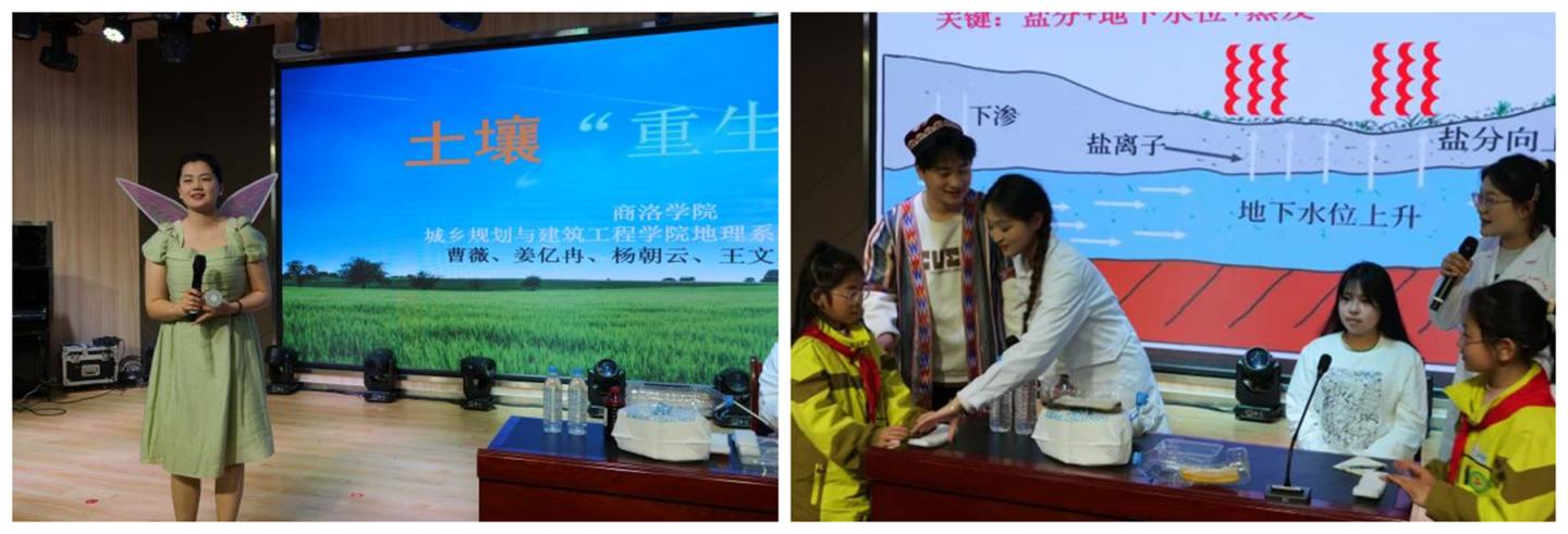 3月26日下午,在商洛市小學(xué)和商州區(qū)第六小學(xué),房舒博士帶領(lǐng)由曹薇、姜億冉、楊朝云、王文睿、高慶欣等地理科學(xué)專(zhuān)業(yè)學(xué)生組成的“土壤奇妙旅團(tuán)”,開(kāi)展了《土壤重生記》科普情景劇活動(dòng)?;顒?dòng)以新疆農(nóng)民買(mǎi)買(mǎi)提改良鹽堿地的案例為背景,通過(guò)情景劇的形式生動(dòng)展現(xiàn)了土壤科學(xué)家如何幫助農(nóng)民改善土地質(zhì)量。團(tuán)隊(duì)設(shè)計(jì)了物理方法、化學(xué)方法和生物方法三種土壤改良技術(shù)的實(shí)驗(yàn)演示,讓學(xué)生們直觀(guān)了解土壤改良的科學(xué)原理?;顒?dòng)過(guò)程中,團(tuán)隊(duì)成員與小學(xué)生積極互動(dòng),通過(guò)問(wèn)答和實(shí)驗(yàn)操作,深入淺出地講解了土壤保護(hù)的重要性。這種“實(shí)驗(yàn)+話(huà)劇”的創(chuàng)新教學(xué)模式,有效激發(fā)了學(xué)生們對(duì)地理科學(xué)的興趣。