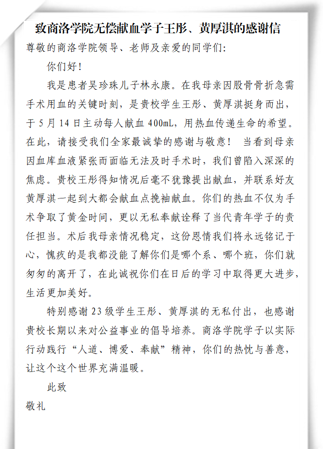 日前,一封字字懇切的感謝信送達(dá)商洛學(xué)院,患者吳珍珠的兒子林永康在信中深情致謝商洛學(xué)院藝術(shù)學(xué)院音樂2303班的王彤與黃厚淇兩名學(xué)子。感謝他們在自己的母親股骨骨折手術(shù)因血庫告急而瀕臨推遲的危急時刻,挺身而出,主動獻(xiàn)血800毫升,幫助患者渡過醫(yī)治難關(guān)。