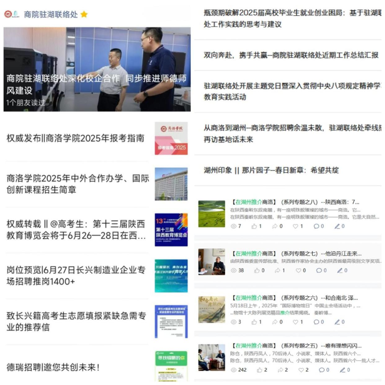 講好商院故事,提升社會影響力。通過“商院駐湖聯(lián)絡(luò)處”公眾號發(fā)布聯(lián)絡(luò)處工作動態(tài)、階段性工作總結(jié)、學(xué)校重點新聞、就業(yè)政策解讀、企業(yè)招聘動態(tài)等內(nèi)容260余篇。其中,發(fā)布“在湖州推介商洛”系列內(nèi)容8篇,發(fā)表《商洛學(xué)院駐湖州就業(yè)人才工作聯(lián)絡(luò)處積極開展系列活動》《雙向奔赴,攜手共贏--商院駐湖聯(lián)絡(luò)處近期工作總結(jié)匯報》《湖州·商洛學(xué)院:共譜雙向奔赴之華章》等總結(jié)綜述性文章6篇,構(gòu)筑起“信息集散地”與“校地交流窗口”的雙向樞紐,既主動向外展示學(xué)校形象、聯(lián)絡(luò)處成果與商洛特色,亦向內(nèi)傳遞湖州產(chǎn)業(yè)生態(tài)、就業(yè)趨勢與政策紅利。
