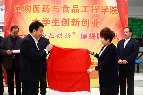 彭虎軍、金淑霞走進“哈尼烘焙”屋與師生交流,參觀制作流程,詢問項目運營情況,并鼓勵團隊成員積極探索、勇于創(chuàng)新。教務處、學生處、招生就業(yè)處、校團委、保衛(wèi)處、后勤保障處、生物醫(yī)藥與食品工程學院等單位相關負責人及“哈尼烘焙”屋創(chuàng)業(yè)團隊成員共同見證“哈尼烘焙”屋揭牌。