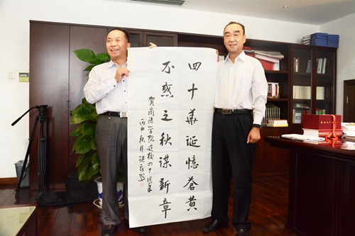 9月29日,紀委書記王思懷赴西安拜訪了西安建筑科技大學黨委副書記、商洛學院原黨委書記張繼良,向他介紹了我校紀念建校40周年活動安排以及籌備工作進展情況。張繼良欣然為學校40華誕題字:四十華誕憶蒼黃,不惑之秋謀新章。