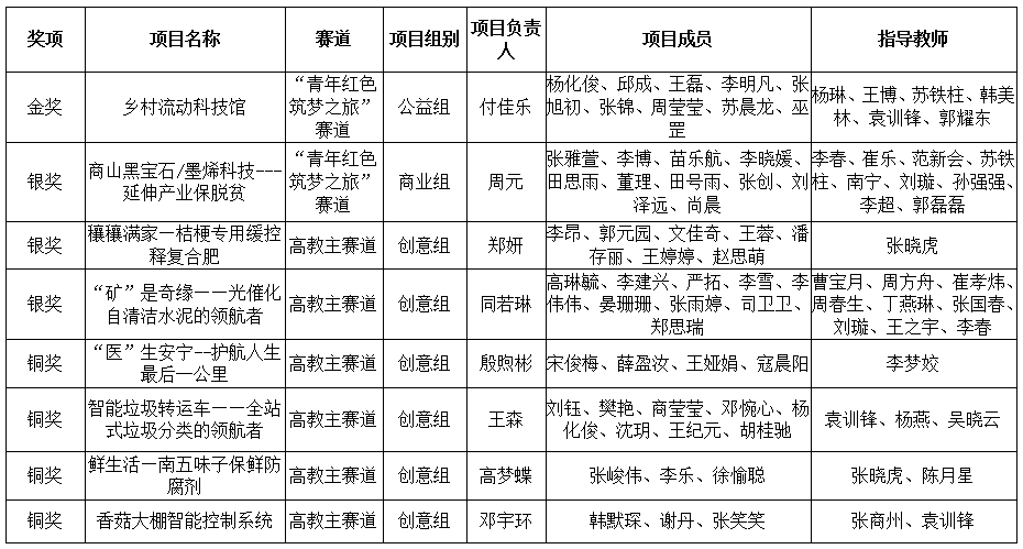 本屆大賽自今年6月啟動(dòng)以來(lái),我省共有106所學(xué)校報(bào)名參加,參賽項(xiàng)目突破4萬(wàn)項(xiàng),較去年增加近3000項(xiàng),參賽學(xué)生突破18.4萬(wàn)人次,較去年增加1.8萬(wàn),經(jīng)校級(jí)初賽、網(wǎng)絡(luò)初審、會(huì)議評(píng)審、線上路演、評(píng)委會(huì)評(píng)審等環(huán)節(jié)后,最終產(chǎn)生金獎(jiǎng)100項(xiàng),單項(xiàng)獎(jiǎng)7項(xiàng)。我?;膶W(xué)院學(xué)生付佳樂負(fù)責(zé)的《鄉(xiāng)村流動(dòng)科技館》項(xiàng)目獲“青年紅色筑夢(mèng)之旅”賽道金獎(jiǎng);化材學(xué)院學(xué)生周元負(fù)責(zé)的《商山黑寶石/墨烯科技---延伸產(chǎn)業(yè)保脫貧》項(xiàng)目獲得“青年紅色筑夢(mèng)之旅”賽道銀獎(jiǎng);生物學(xué)院學(xué)生鄭妍負(fù)責(zé)的《穰穰滿家—桔梗專用緩控釋復(fù)合肥》項(xiàng)目、化材學(xué)院學(xué)生同若琳負(fù)責(zé)的《“礦”是奇緣——光催化自清潔水泥的領(lǐng)航者》項(xiàng)目獲得高教主賽道銀獎(jiǎng);健康管理學(xué)院學(xué)生殷煦彬負(fù)責(zé)的《“醫(yī)”生安寧--護(hù)航人生最后一公里》項(xiàng)目、生物學(xué)院學(xué)生高夢(mèng)蝶負(fù)責(zé)的《鮮生活—南五味子保鮮防腐劑》項(xiàng)目、電信學(xué)院學(xué)生王森負(fù)責(zé)的《智能垃圾轉(zhuǎn)運(yùn)車——全站式垃圾分類的領(lǐng)航者》項(xiàng)目、電信學(xué)院學(xué)生鄧宇環(huán)負(fù)責(zé)的《香菇大棚智能控制系統(tǒng)》項(xiàng)目獲得高教主賽道銅獎(jiǎng)。