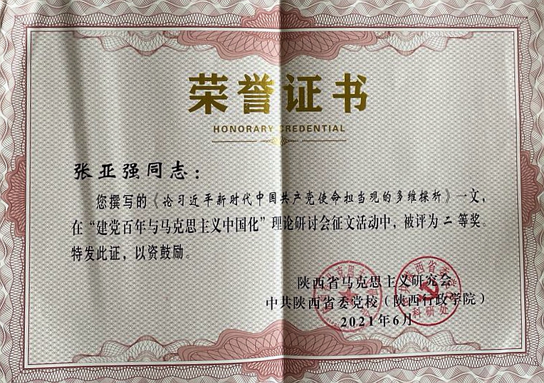 為隆重慶祝建黨百年,總結(jié)回顧馬克思主義中國(guó)化的歷史進(jìn)程、寶貴經(jīng)驗(yàn)、思想啟示,陜西省馬克思主義研究會(huì)與中共陜西省委黨校共同舉辦了“建黨百年與馬克思主義中國(guó)化”理論研討會(huì)征文活動(dòng)。我校馬克思主義學(xué)院副教授張亞強(qiáng)撰寫(xiě)的論文《論習(xí)近平新時(shí)代中國(guó)共產(chǎn)黨使命擔(dān)當(dāng)觀的多維探析》在評(píng)選活動(dòng)中榮獲二等獎(jiǎng)。