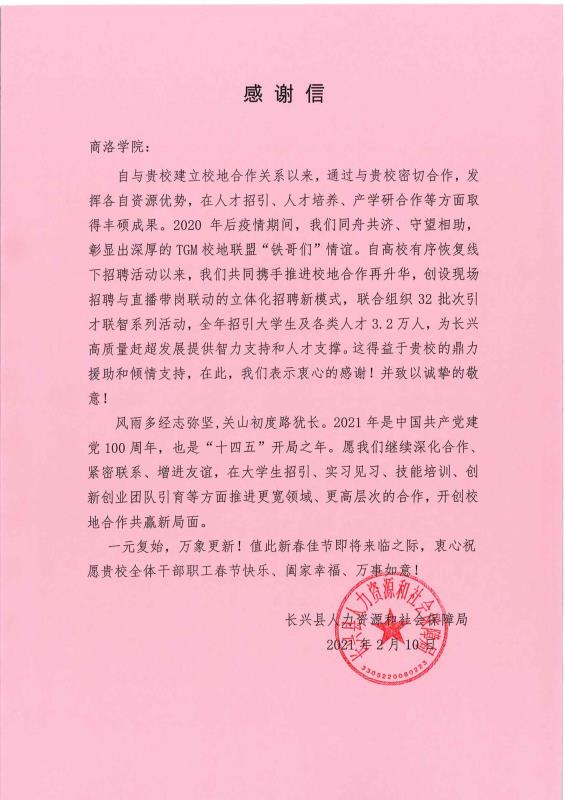 春節(jié)前夕,浙江省湖州市長興縣向我校發(fā)來感謝信,高度肯定我校為當(dāng)?shù)厝瞬耪幸透哔|(zhì)量趕超發(fā)展做出的積極貢獻(xiàn),重申了與我校在抗擊疫情、復(fù)工復(fù)產(chǎn)中凝結(jié)的同舟共濟、守望相助的友好關(guān)系。希望與我校進(jìn)一步擴展合作領(lǐng)域,提升合作層次,開創(chuàng)校地合作共贏新局面。