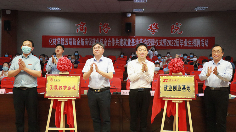 在熱烈的掌聲中,彭虎軍、王新軍與現(xiàn)場參會企業(yè)代表為校企合作共建“大學(xué)生就業(yè)創(chuàng)業(yè)基地”和“實踐教學(xué)基地”揭牌。楊存典、王怡代表學(xué)校通過“線下”和“云簽約”的形式分別與用人單位簽訂《商洛學(xué)院大學(xué)生就業(yè)創(chuàng)業(yè)基地協(xié)議》和《商洛學(xué)院校外實踐教學(xué)基地協(xié)議》。