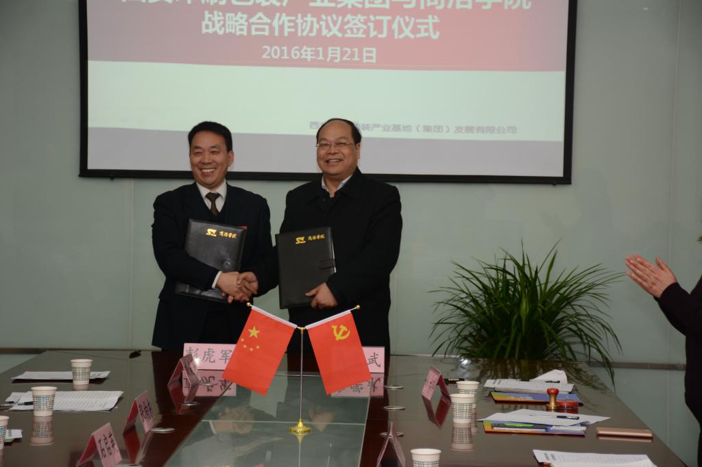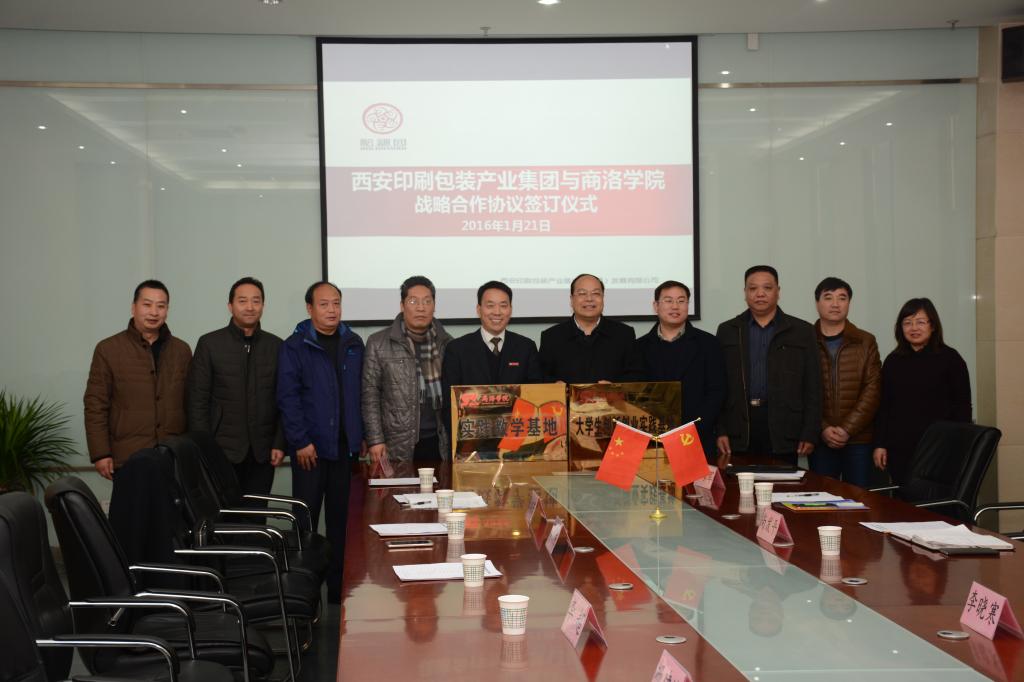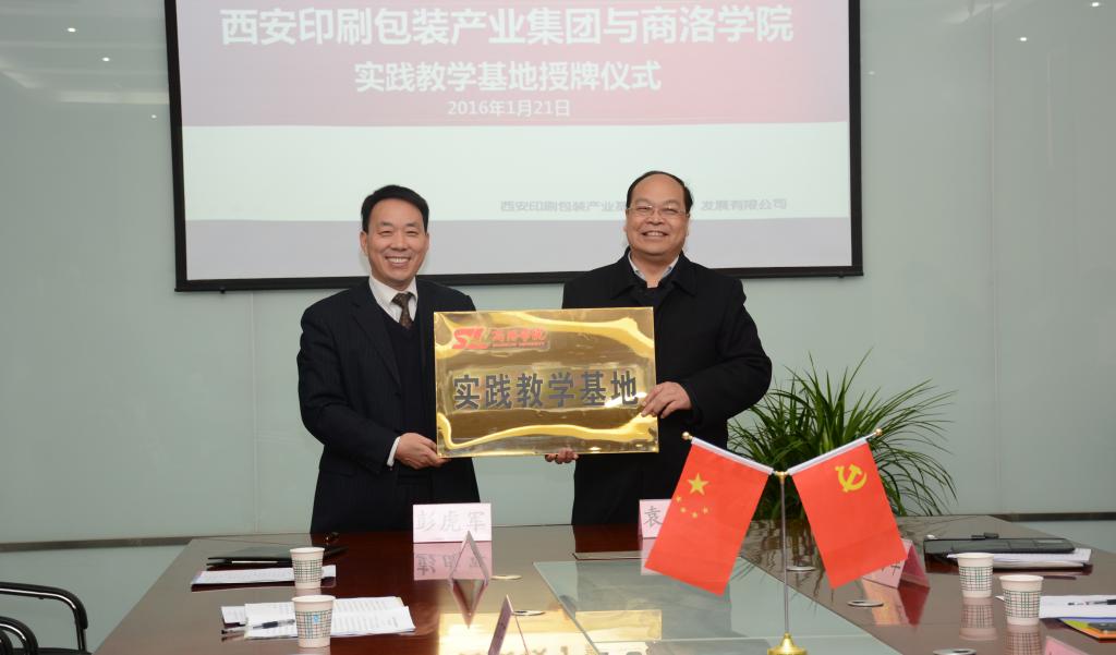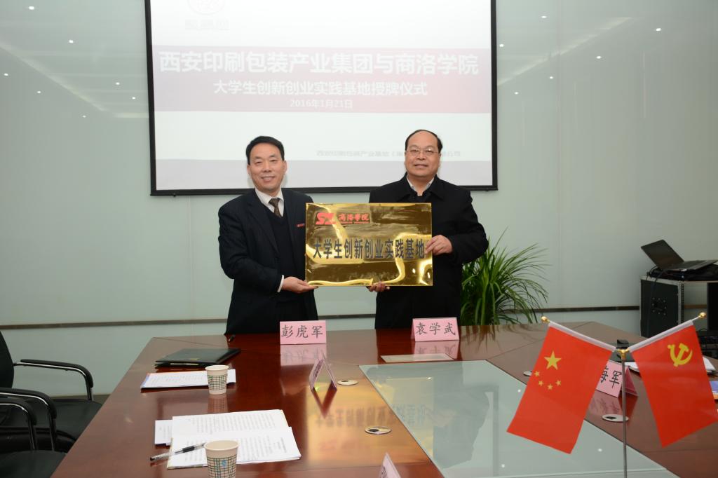 2016年1月21日,我校與西安印刷包裝產(chǎn)業(yè)集團(tuán)在西安經(jīng)濟(jì)技術(shù)開發(fā)區(qū)草灘生態(tài)產(chǎn)業(yè)園簽署戰(zhàn)略合作協(xié)議并舉行授牌儀式。校黨委副書記彭虎軍與西安印刷包裝產(chǎn)業(yè)集團(tuán)董事長(zhǎng)袁學(xué)武代表校企雙方在協(xié)議上簽字。彭虎軍在簽約儀式之后向西安印刷包裝產(chǎn)業(yè)集團(tuán)授予“商洛學(xué)院大學(xué)生創(chuàng)新創(chuàng)業(yè)實(shí)踐基地”和“商洛學(xué)院教學(xué)實(shí)踐基地”牌。學(xué)校黨政辦公室、教務(wù)處、學(xué)生處、招生就業(yè)處等部門領(lǐng)導(dǎo),西安印刷包裝產(chǎn)業(yè)集團(tuán)黨總支副書記劉海軍及集團(tuán)有關(guān)部門人員參加了簽約授牌儀式。簽約授牌儀式由劉海軍主持。