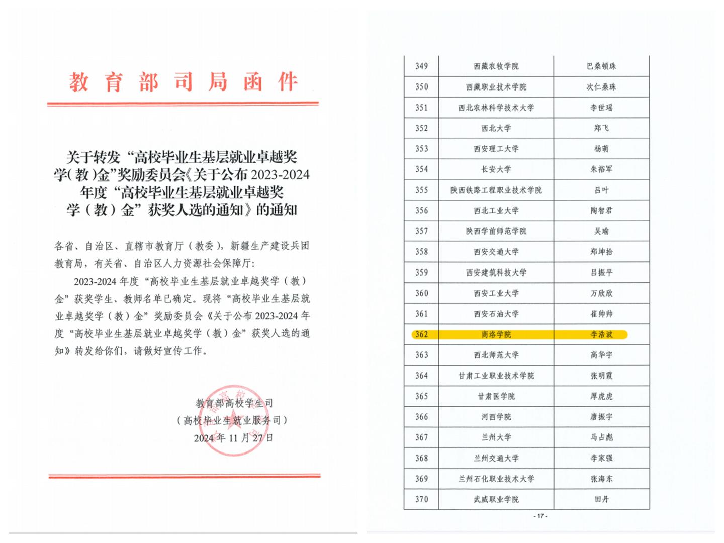 日前,教育部高校學(xué)生司發(fā)布了《關(guān)于公布2023-2024年度“高校畢業(yè)生基層就業(yè)卓越獎學(xué)(教)金”獲獎人選的通知》,我?;瘜W(xué)工程與現(xiàn)代材料學(xué)院化學(xué)專業(yè)2018屆畢業(yè)生李浩波赴新疆基層就業(yè)事跡成功入選,獲評全國“高校畢業(yè)生基層就業(yè)卓越獎學(xué)金”,陜西省高校共有12名優(yōu)秀畢業(yè)生獲此殊榮,也是我校畢業(yè)生首次獲得該項(xiàng)獎勵。