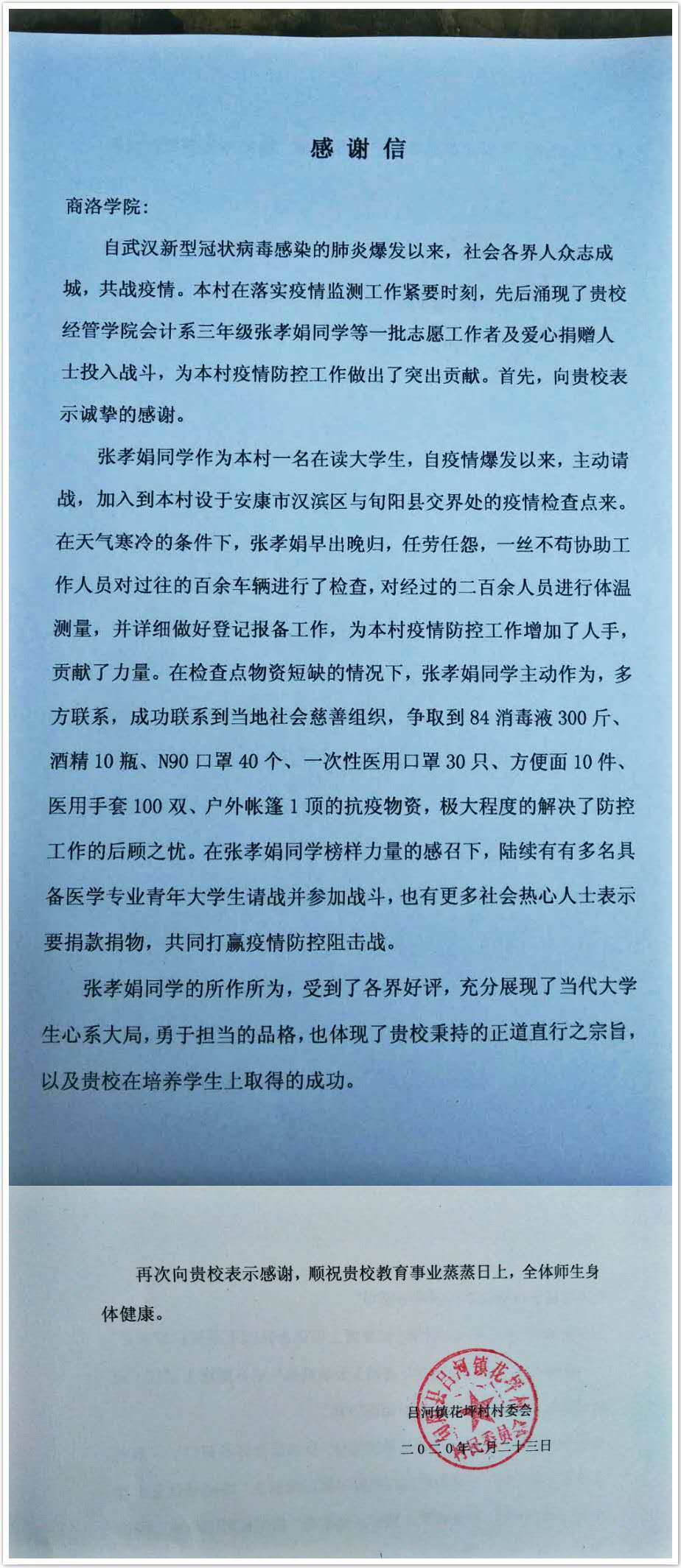 張孝娟同學(xué)的事跡受到鄉(xiāng)鎮(zhèn)領(lǐng)導(dǎo)、公安民警、村委會書記等人的一致好評,為對張孝娟同學(xué)本人以及商洛學(xué)院致謝,呂河鎮(zhèn)花坪村村委會專門向我校發(fā)來了感謝信。