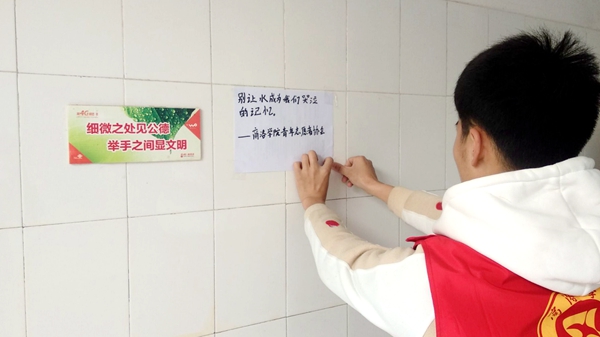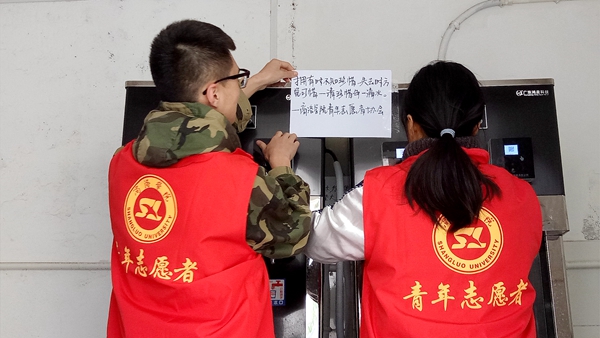 青年志愿者協(xié)會開展“珍惜水資源,為生命留一條清流”活動?;顒又?,志愿者們分別在教學樓各處飲水機、宿舍樓水龍頭旁張貼珍惜水資源的愛心標語,倡導師生們節(jié)水愛水,保護我們賴以生存的水資源。