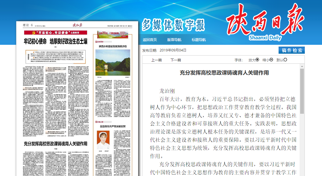 黨委書記龍治剛在《陜西日報》2019年9月4日第6版發(fā)表理論文章《充分發(fā)揮高校思政課鑄魂育人關鍵作用》,學習強國平臺全文轉載。文章內(nèi)容如下: