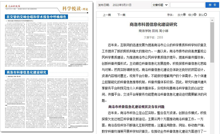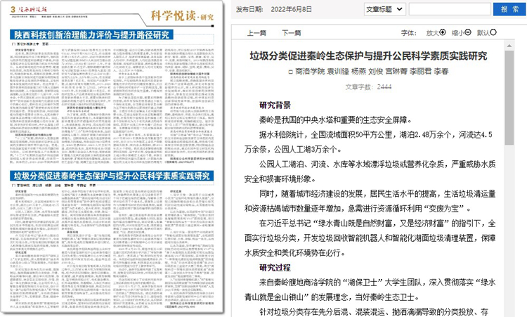 5月份以來,我校教師袁訓鋒、田祎、王丹丹先后在《陜西科技報》理論版刊發(fā)《垃圾分類促進秦嶺生態(tài)保護與提升公民科學素質實踐研究》《商洛市科普信息化建設研究》《融媒體時代非物質文化遺產(chǎn)的創(chuàng)新型傳播研究》三篇文章,圍繞秦嶺生態(tài)保護、科普信息化建設、非物質遺產(chǎn)創(chuàng)新傳播等主題,介紹我校科研服務地方實踐成果和經(jīng)驗。文章主要內容如下:
