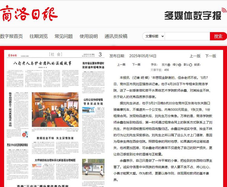 余鑫表示,自己只是做了一件平常的小事,把撿到的東西物歸原主罷了。誠(chéng)實(shí)守信是中華民族的傳統(tǒng)美德,做人要不貪不占、將心比心,小善才能聚大愛。作為教師,更要以身作則,體現(xiàn)高校教師的基本素養(yǎng)。