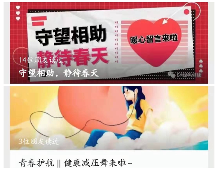 為切實(shí)做好疫情封校期間學(xué)生防疫知識(shí)普及、心理疏導(dǎo)等工作,進(jìn)一步加強(qiáng)對(duì)學(xué)生的人文關(guān)懷,健康管理學(xué)院團(tuán)總支堅(jiān)持以學(xué)生為主體,以育人為中心,以活動(dòng)為載體,堅(jiān)持貼近實(shí)際、貼近生活、貼近學(xué)生原則,借助學(xué)院微信公眾號(hào)、易班平臺(tái)等載體,開(kāi)展了一系列內(nèi)容鮮活、形式新穎、吸引力強(qiáng)的活動(dòng),活動(dòng)效果良好。