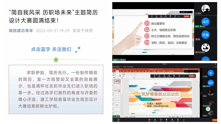 機會為主,深化“訪企拓崗”成果,擴展就業(yè)空間。學(xué)院扎實落實“書記校長訪企拓崗”所達成校企合作協(xié)議,重點圍繞人才培養(yǎng)與供給,充分發(fā)揮“訪企拓崗”成果效應(yīng)。一是不斷優(yōu)化校企互動互補機制。緊抓企業(yè)人才需求點,實施專人專場專單位制度,重點邀請中天西北建設(shè)投資集團有限公司、中國核工業(yè)二四建設(shè)有限公司、陜西建工第一建設(shè)集團等10家訪企拓崗企業(yè)開展線上招聘宣講會;發(fā)揮已聘校企聯(lián)絡(luò)員作用,邀請中國能源建設(shè)集團江蘇電力第一建設(shè)公司等國企或央企同步開展招聘宣講。截至23日,已有19家單位開展了線上招聘宣講會,共提供招聘崗位970余個,是本屆畢業(yè)生人數(shù)的3倍,為學(xué)生就業(yè)提供了充分的就業(yè)機會。二是舉辦簡歷設(shè)計大賽。為了增強學(xué)生的就業(yè)意識,幫助學(xué)生確立合理的就業(yè)定位,讓學(xué)生就業(yè)“有備而發(fā)”,學(xué)院通過舉辦首屆簡歷設(shè)計大賽,鼓勵所有畢業(yè)生設(shè)計和制作能夠充分展示自己專業(yè)技能的就業(yè)簡歷,來自城鄉(xiāng)規(guī)劃等4個專業(yè)的119名畢業(yè)生設(shè)計制作的簡歷入圍本次大賽,其中部分獲獎學(xué)生已與企業(yè)簽訂了就業(yè)協(xié)議。
