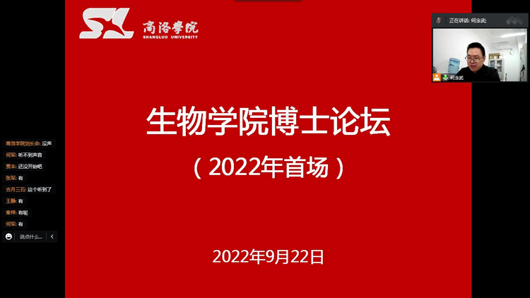 9月22日,生物醫(yī)藥與食品工程學院博士論壇2022年首場學術(shù)交流活動在云端順利舉行。本次論壇特邀我院2位客座教授——西北大學博士生導師趙桂仿,陜西省農(nóng)村科技開發(fā)中心、陜西省獼猴桃工程技術(shù)研究中心主任雷玉山研究員蒞臨云端全程指導。生物學院院長王學軍出席論壇活動。生物學院全體教師及部分畢業(yè)班學生在線上參加論壇。論壇由副院長何念武主持。
