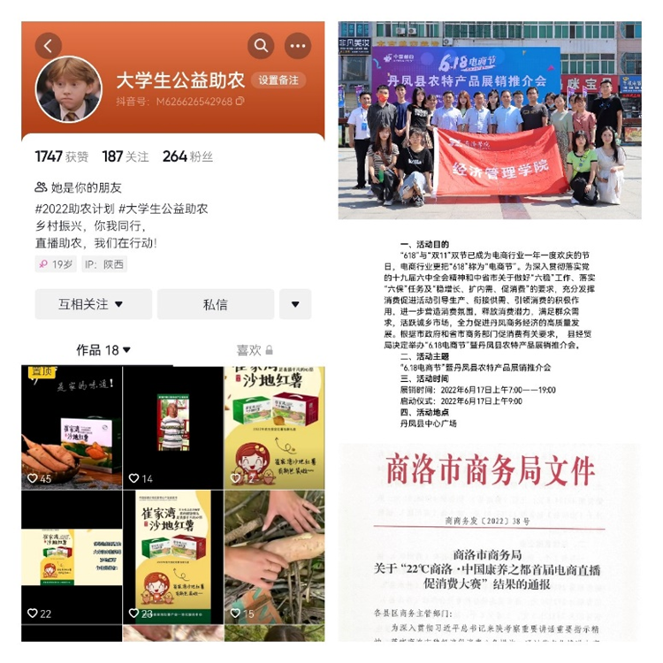 加強技術幫扶,推動縣域經(jīng)濟發(fā)展。學院根植地方“電子商務助力數(shù)字鄉(xiāng)村建設與縣域產業(yè)結構升級團隊”圍繞自身學科優(yōu)勢,以丹鳳縣2022年“6·18電商節(jié)”暨農特產品展銷推介會為契機,結合“經(jīng)管院首屆直播大賽”的舉辦,充分利用在校師生在短視頻運營、電商直播的專業(yè)積累,助力如陜西商於本草中藥材有限公司、丹鳳葡萄酒廠等丹鳳縣特色農產品經(jīng)營企業(yè)開展直播銷售,形成一批具有一定人氣和粉絲量的電商助農類運營賬號,借助電商營銷手段、模式充分促進活動引導生產、銜接供需、引領消費的積極作用,活躍城鄉(xiāng)市場,促進丹鳳電子商務經(jīng)濟的高質量發(fā)展。