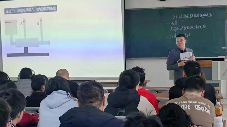 水江麗老師以《聚焦核心素養(yǎng),促進(jìn)深度學(xué)習(xí)》為題作了專(zhuān)題學(xué)術(shù)報(bào)告,從核心素養(yǎng)重構(gòu)未來(lái)教育藍(lán)圖、基于核心素養(yǎng)的教學(xué)設(shè)計(jì)和促進(jìn)深度學(xué)習(xí)的教學(xué)建議三個(gè)方面闡述了中學(xué)物理教學(xué)中如何聚集核心素養(yǎng)培養(yǎng)、促進(jìn)學(xué)生深度學(xué)習(xí)。柴勇勇老師在示范教學(xué)《流速與壓強(qiáng)的關(guān)系》一課講授中,從小實(shí)驗(yàn)引入新課,通過(guò)圖片補(bǔ)充讓學(xué)生輕松接受流體的概念,再通過(guò)實(shí)驗(yàn)讓學(xué)生總結(jié)得出科學(xué)結(jié)論,并運(yùn)用結(jié)論解釋生活中的各種現(xiàn)象。