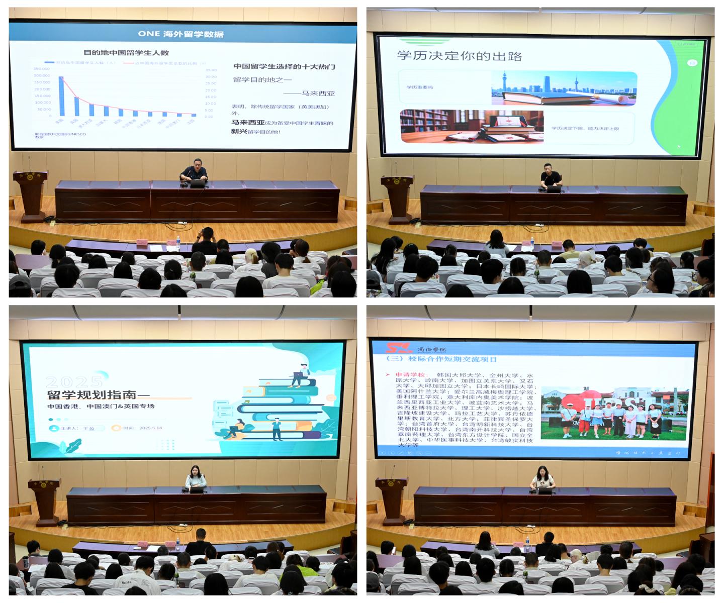 宣講會上,陜西省學(xué)生就業(yè)與留學(xué)服務(wù)中心姚運章、于智丞、王盈三位老師分別就德國、馬來西亞、日本、韓國、英國等國家高校碩士項目優(yōu)勢特色、申請政策、留學(xué)生就業(yè)政策等進(jìn)行了詳細(xì)解讀。國際合作與交流處楊嬌詳細(xì)介紹了我校學(xué)生出國(境)交流學(xué)習(xí)項目途徑和獎勵資助政策。學(xué)生代表財務(wù)管理2231班張思揚、財務(wù)管理2331班衛(wèi)一蘋分享了各自在馬來西亞博特拉大學(xué)交換學(xué)習(xí)和牛津大學(xué)訪學(xué)期間的見聞與收獲,以親身經(jīng)歷激發(fā)同學(xué)們對國際化學(xué)習(xí)的熱情。