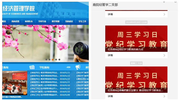 開設一個“黨紀學習教育”專欄。學院黨委按照黨紀學習教育方案部署,指導學院各宣傳媒體平臺開設“黨紀學習教育”專欄,經(jīng)濟管理學院網(wǎng)站開設“黨紀學習教育”專欄,已推送黨紀學習教育學習鏈接、學習卡片30余條;學院網(wǎng)站新聞報道學院黨紀學習教育專題新聞近10篇;各黨支部利用支部自媒體公眾號推送黨紀學習教育新聞報道50余次;學生第二黨支部微信公眾號平臺開設了黨紀學習教育“周三學習日”專欄,每周三定期發(fā)布學習內(nèi)容,深入發(fā)揮互聯(lián)網(wǎng)+黨建的育人功能與學習效應。